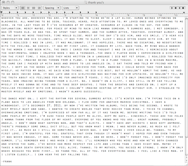 Opowiedział o swojej pierwszej, wielkiej miłości w wieku 19 lat, która odmieniła jego życie. Artysta przyznał że nie  planował publicznego „coming out”, ale nie żałuje tego co zrobił, i wreszcie czuje się naprawdę wolny. Wokaliste wspierają przyjaciele i współpracownicy, a my gratulujemy odwagi. Poniżej 'list’ Franka.