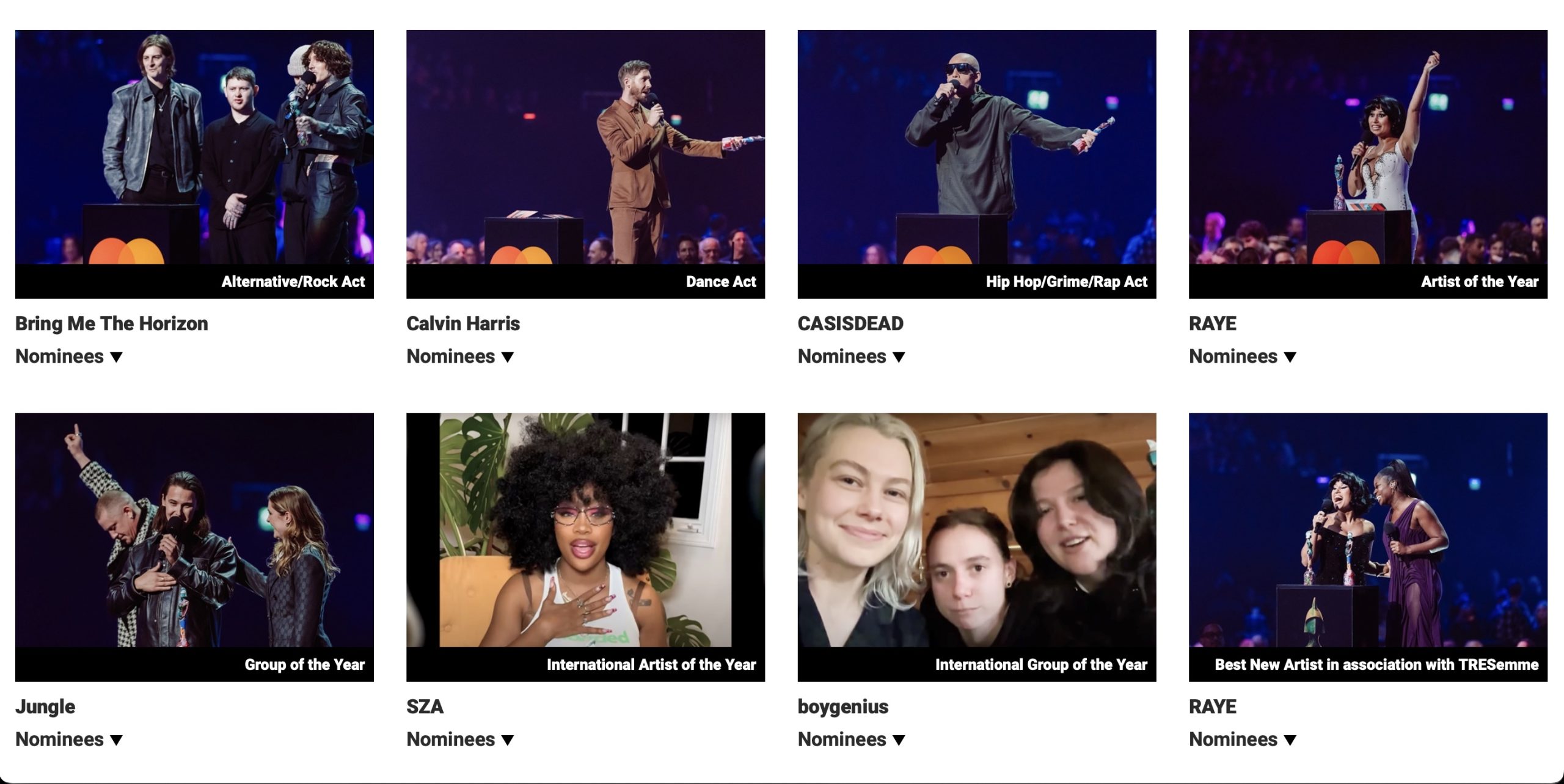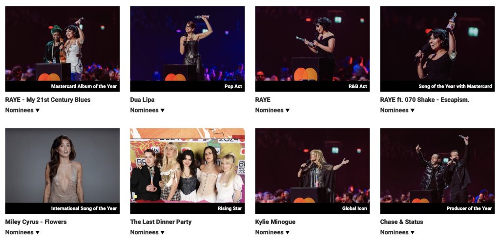 Raye dostała statuetki w kategoriach najlepszy brytyjski album roku – za wspomniany album „My 21st Century Blues”, piosenka roku – za „Escapism”, brytyjski artysta/artystka roku, najlepszy artysta/artystka R&B, najlepszy nowy artysta/artystka, najlepszy autor/autorka piosenek. Jest ona pierwszą kobietą w historii BRIT Awards, która wygrała w tej ostatniej kategorii. Z pośród wszystkich nominacji, przegrała w jednej – najlepszy artysta/artystka pop, gdzie nagrodę otrzymała Dua Lipa.