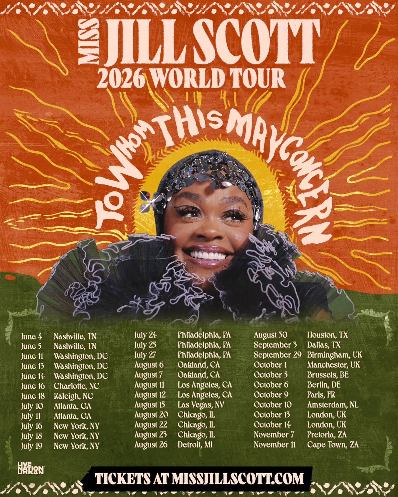 Jill Scott zapowiedziała szczegóły swojej nowej trasy „To Whom This May Concern World Tour”, z którą w 2026 roku odwiedzi Amerykę Północną, Europę oraz Republikę Południowej Afryki. Tournee rozpocznie się 4 czerwca w Nashville i obejmie kilkadziesiąt koncertów w największych miastach.